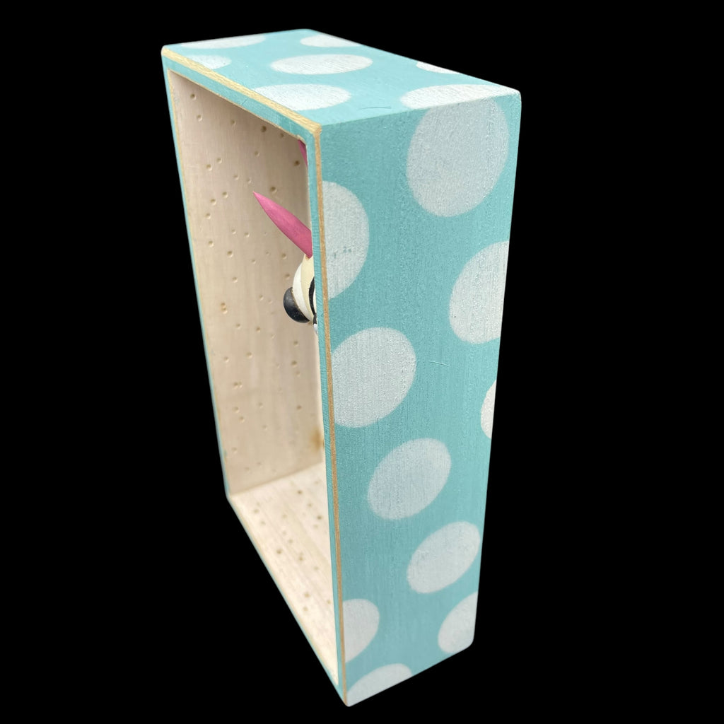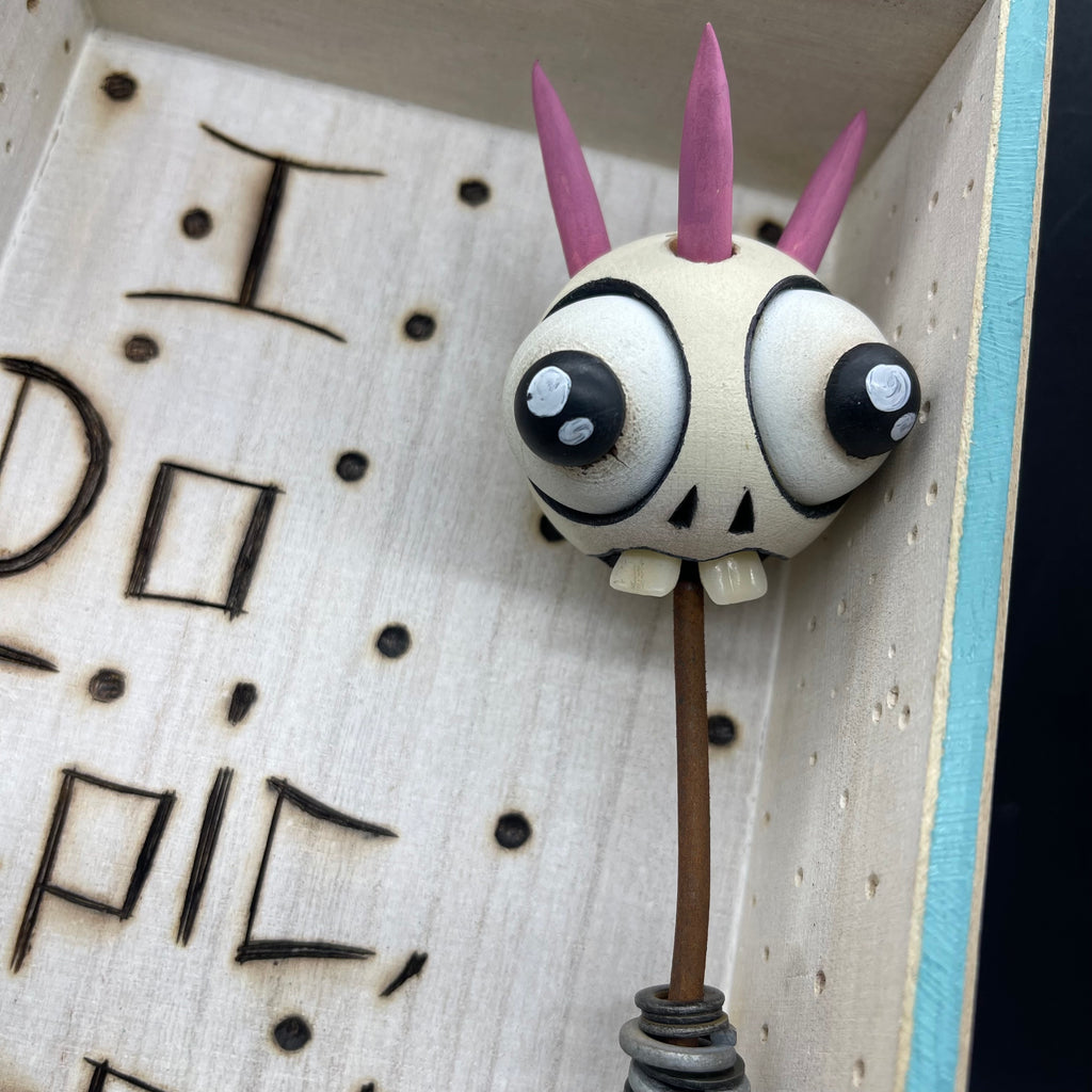 5 1/4"W by 8 1/2"H hand painted, sanded, detailed and wood burned box containing a hand carved, painted, wood burned, detailed assembled and attached C.R.E.E.P. character. The shadow box is equipped with a hanger on the back.