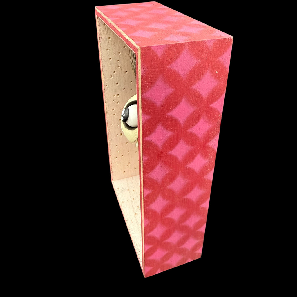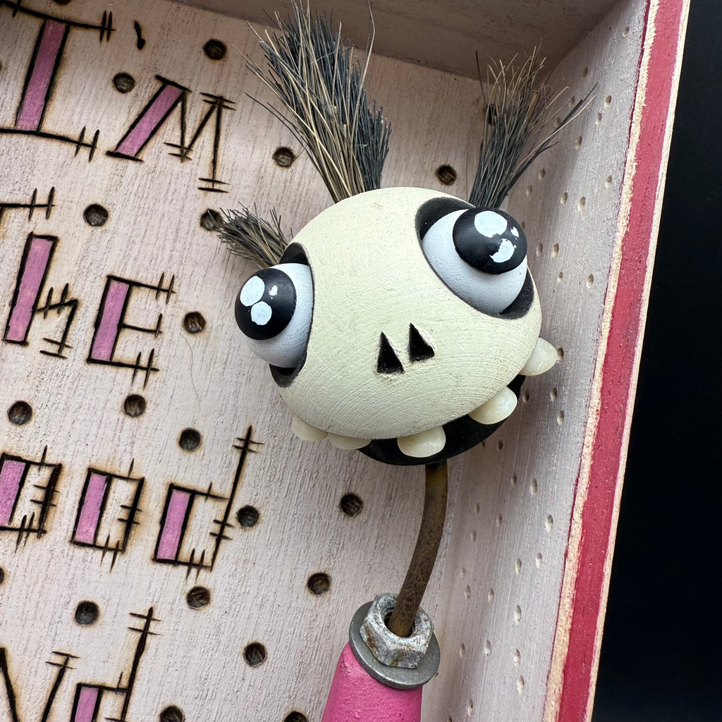 5 1/4"W by 8 1/2"H hand painted, sanded, detailed and wood burned box containing a hand carved, painted, wood burned, detailed assembled and attached C.R.E.E.P. character. The shadow box is equipped with a hanger on the back.