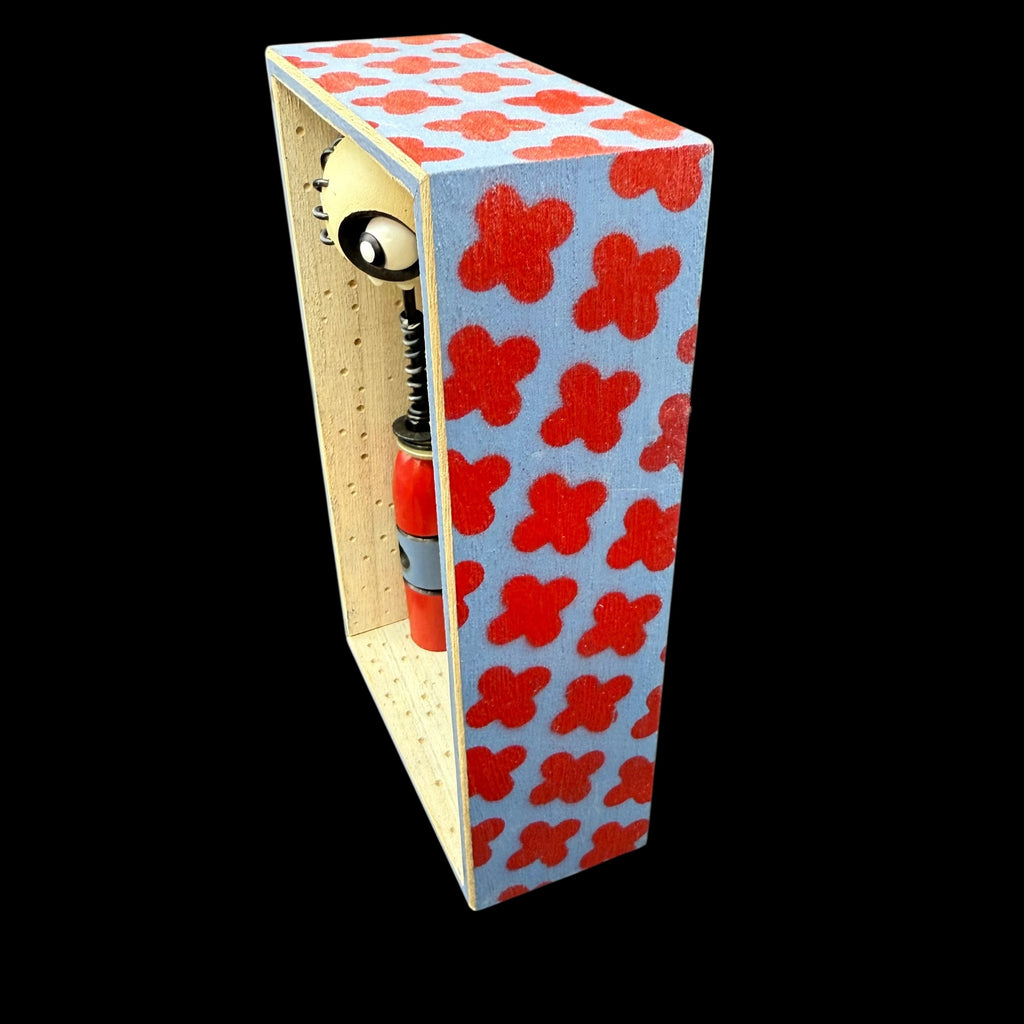 5 1/4"W by 8 1/2"H hand painted, sanded, detailed and wood burned box containing a hand carved, painted, wood burned, detailed assembled and attached C.R.E.E.P. character. The shadow box is equipped with a hanger on the back.