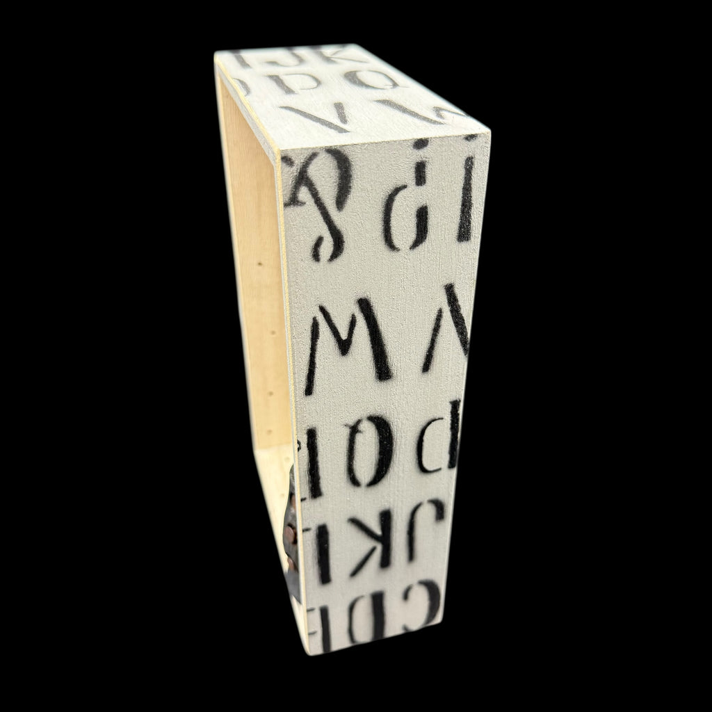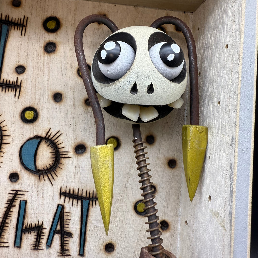 5 1/4"W by 8 1/2"H hand painted, sanded, detailed and wood burned box containing a hand carved, painted, wood burned, detailed assembled and attached C.R.E.E.P. character. The shadow box is equipped with a hanger on the back.