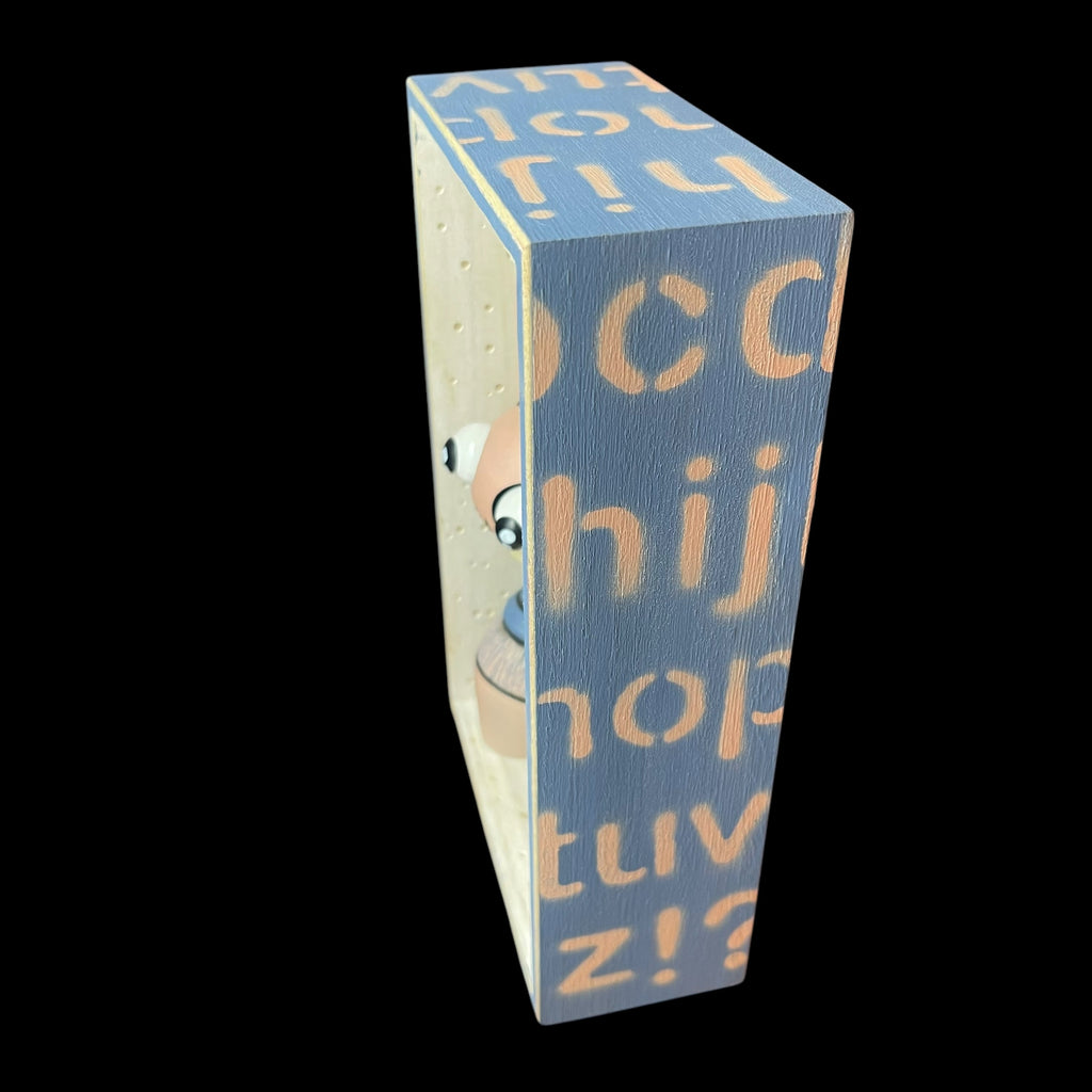 5 1/4"W by 8 1/2"H hand painted, sanded, detailed and wood burned box containing a hand carved, painted, wood burned, detailed assembled and attached C.R.E.E.P. character. The shadow box is equipped with a hanger on the back.