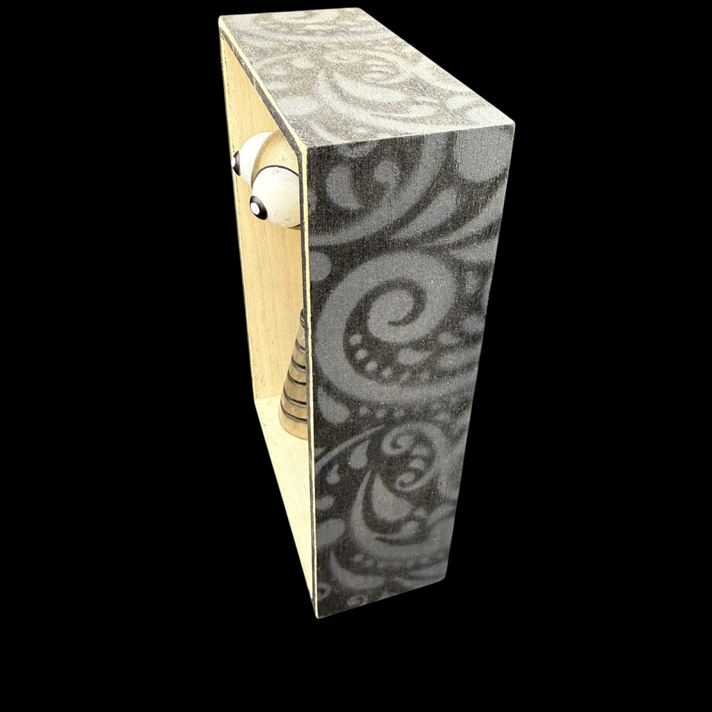 5 1/4"W by 8 1/2"H hand painted, sanded, detailed and wood burned box containing a hand carved, painted, wood burned, detailed assembled and attached C.R.E.E.P. character. The shadow box is equipped with a hanger on the back.
