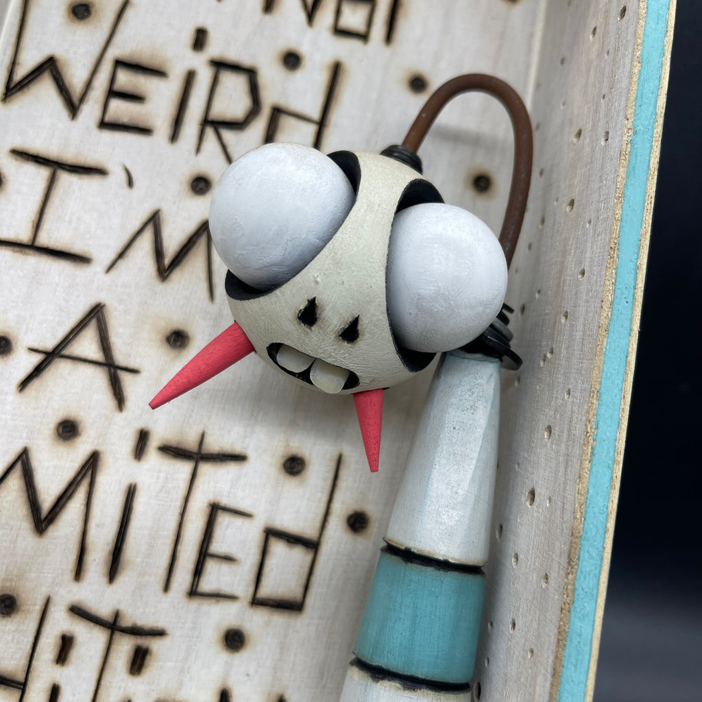 5 1/4"W by 8 1/2"H hand painted, sanded, detailed and wood burned box containing a hand carved, painted, wood burned, detailed assembled and attached C.R.E.E.P. character. The shadow box is equipped with a hanger on the back.