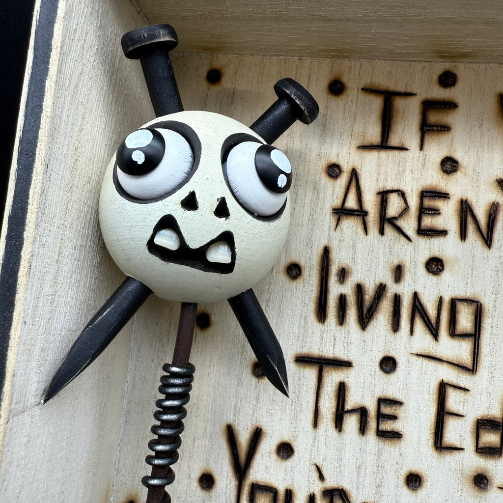 5 1/4"W by 8 1/2"H hand painted, sanded, detailed and wood burned box containing a hand carved, painted, wood burned, detailed assembled and attached C.R.E.E.P. character. The shadow box is equipped with a hanger on the back.