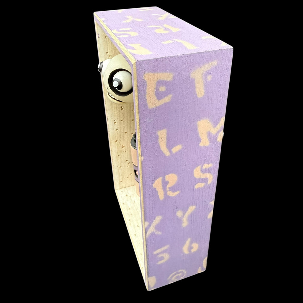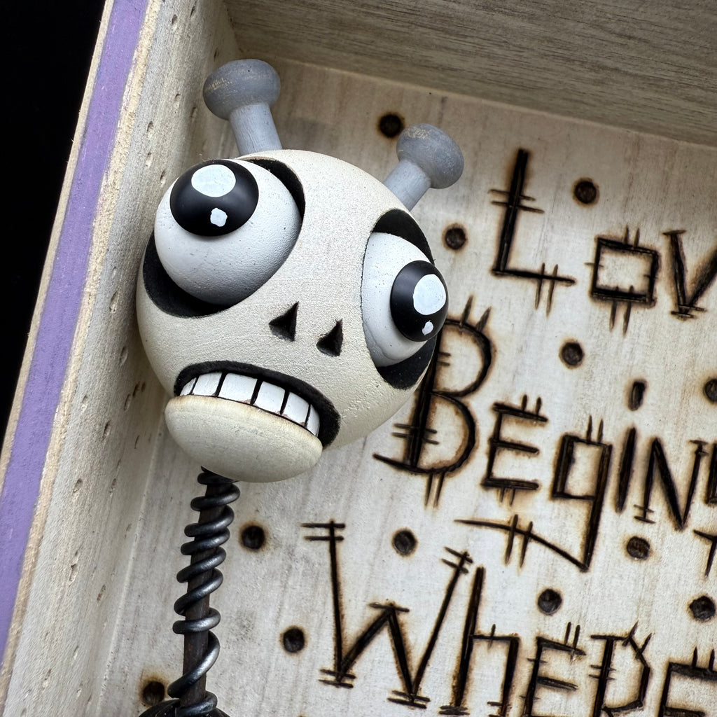 5 1/4"W by 8 1/2"H hand painted, sanded, detailed and wood burned box containing a hand carved, painted, wood burned, detailed assembled and attached C.R.E.E.P. character. The shadow box is equipped with a hanger on the back.