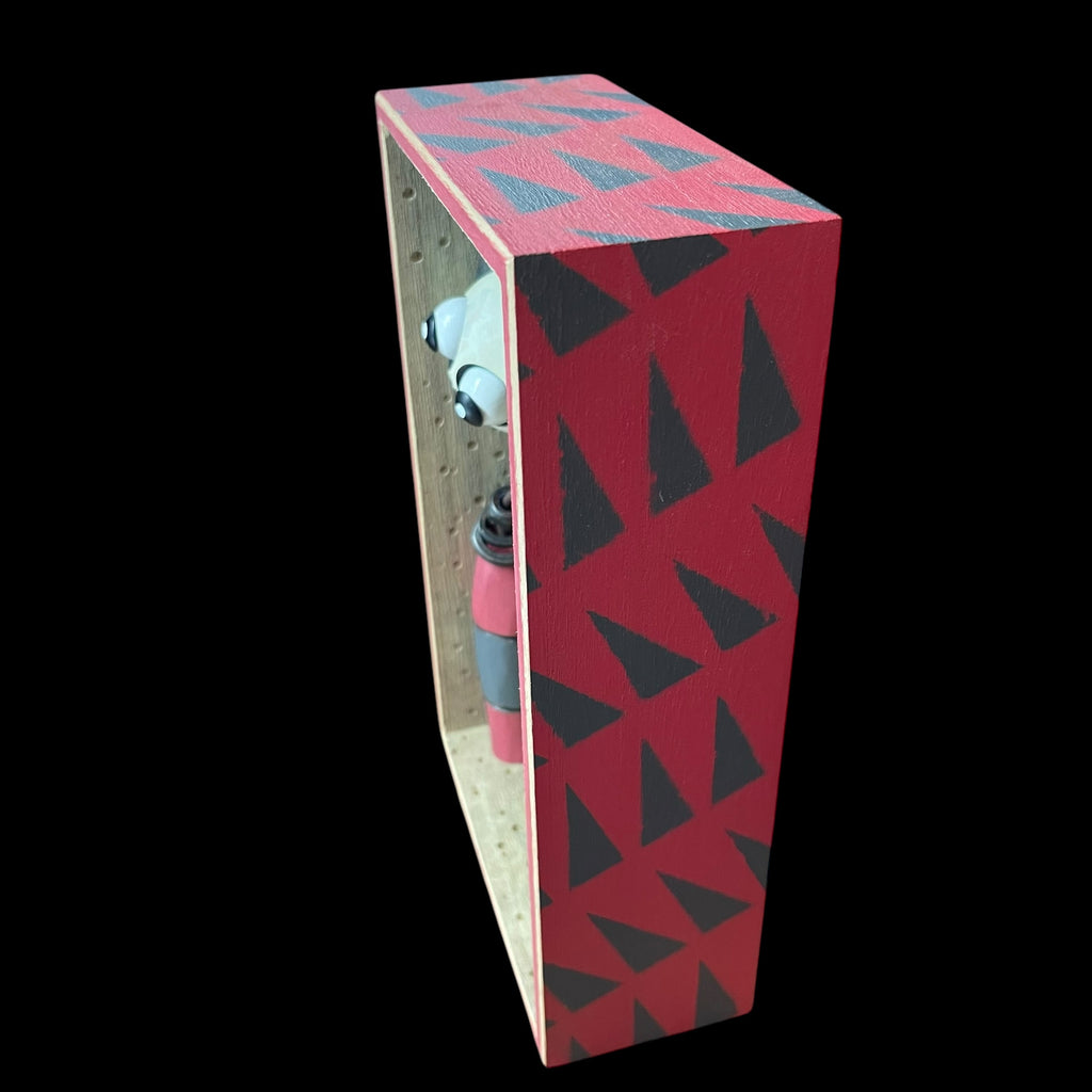 5 1/4"W by 8 1/2"H hand painted, sanded, detailed and wood burned box containing a hand carved, painted, wood burned, detailed assembled and attached C.R.E.E.P. character. The shadow box is equipped with a hanger on the back.