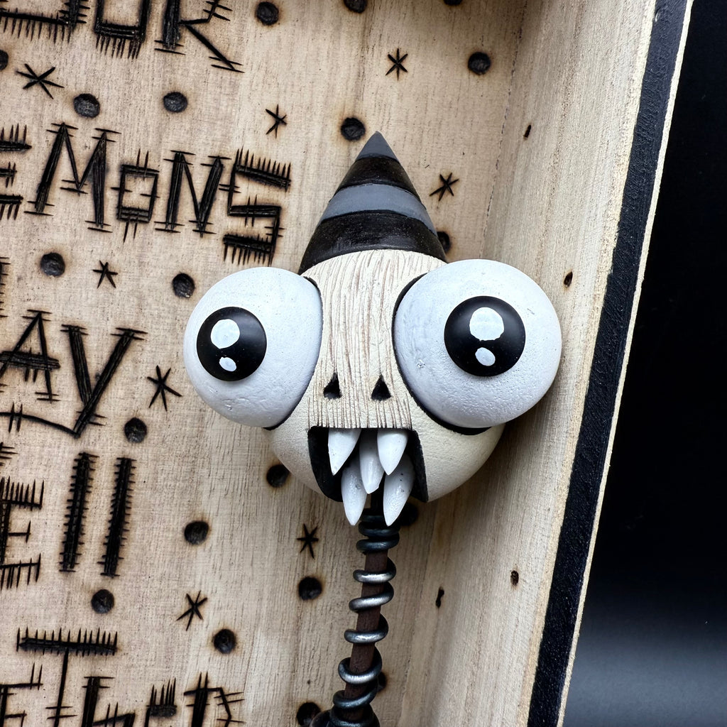 5 1/4"W by 8 1/2"H hand painted, sanded, detailed and wood burned box containing a hand carved, painted, wood burned, detailed assembled and attached C.R.E.E.P. character. The shadow box is equipped with a hanger on the back.