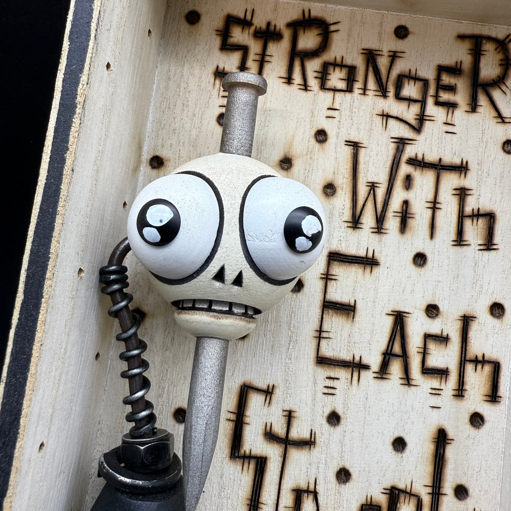 5 1/4"W by 8 1/2"H hand painted, sanded, detailed and wood burned box containing a hand carved, painted, wood burned, detailed assembled and attached C.R.E.E.P. character. The shadow box is equipped with a hanger on the back.