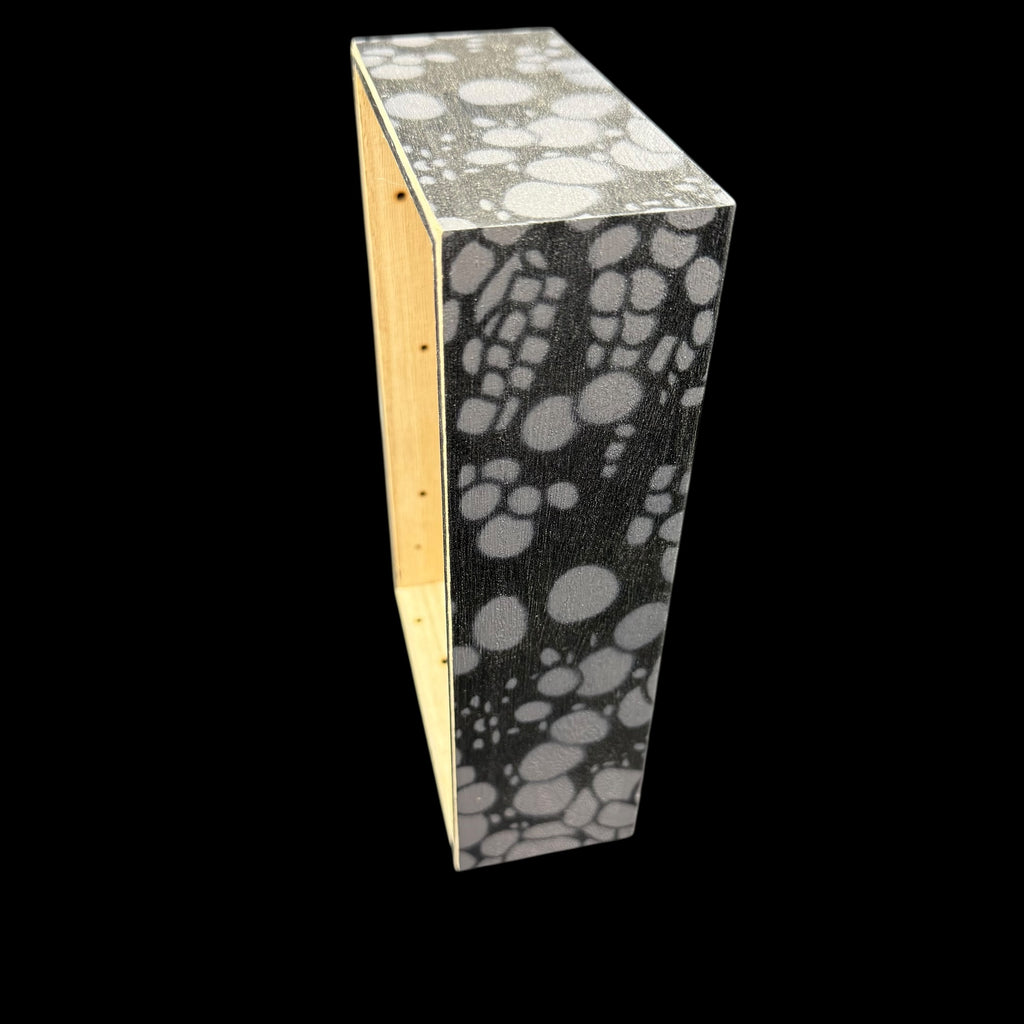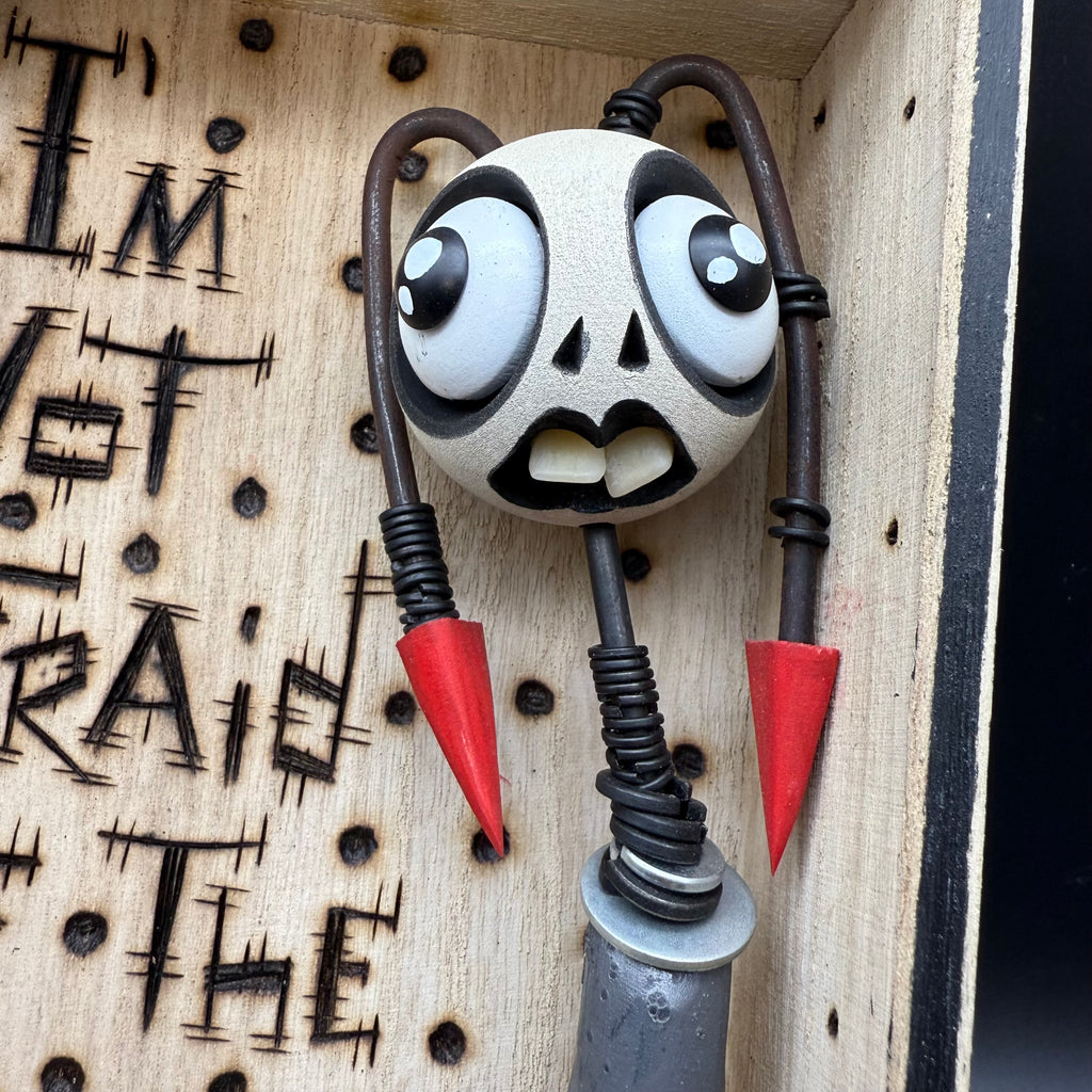 5 1/4"W by 8 1/2"H hand painted, sanded, detailed and wood burned box containing a hand carved, painted, wood burned, detailed assembled and attached C.R.E.E.P. character. The shadow box is equipped with a hanger on the back.