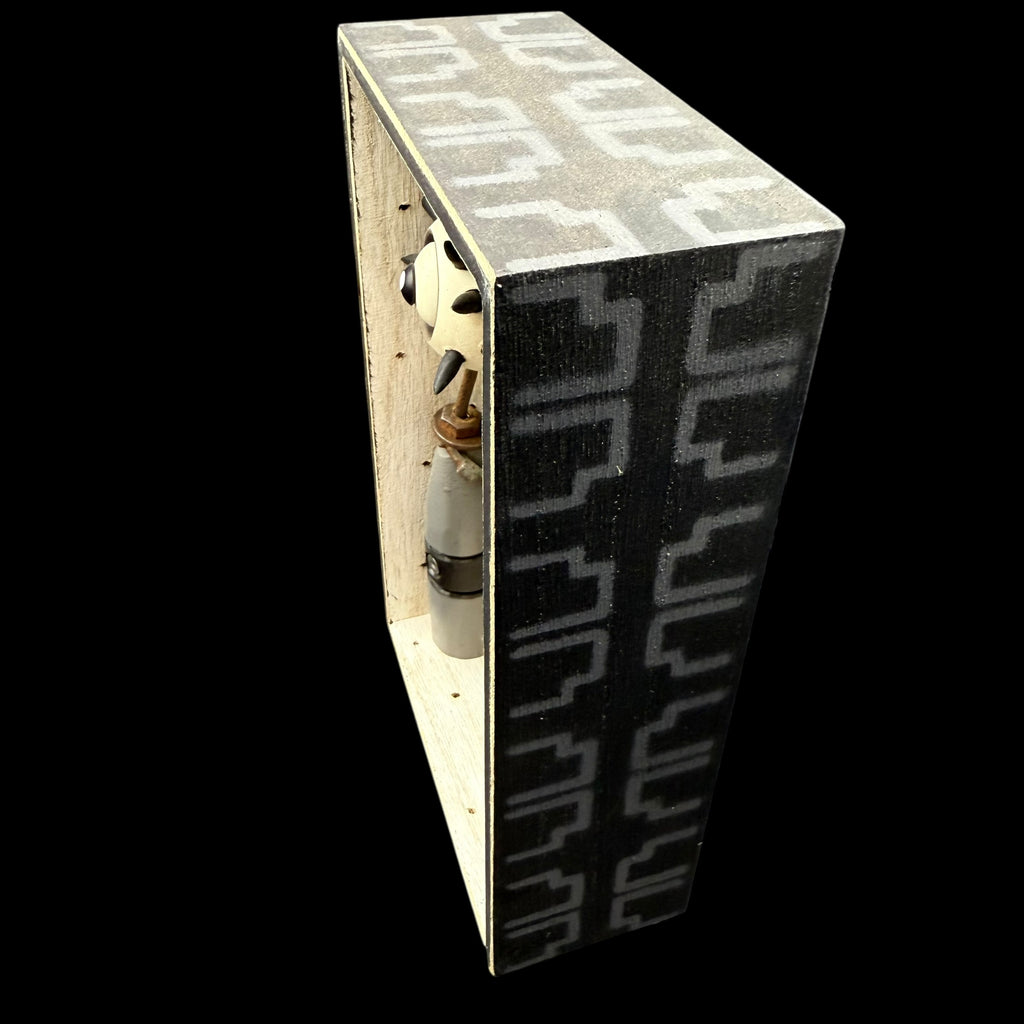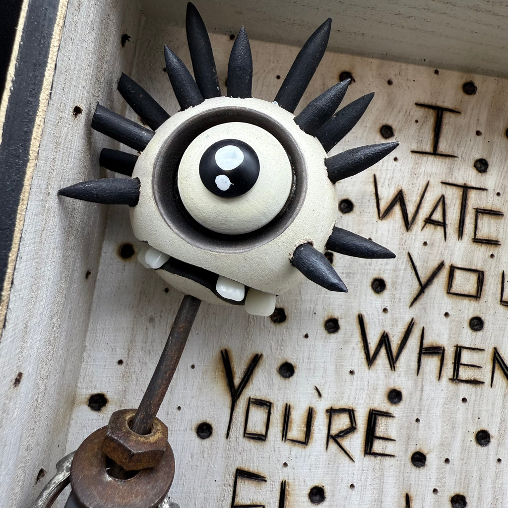 5 1/4"W by 8 1/2"H hand painted, sanded, detailed and wood burned box containing a hand carved, painted, wood burned, detailed assembled and attached C.R.E.E.P. character. The shadow box is equipped with a hanger on the back.