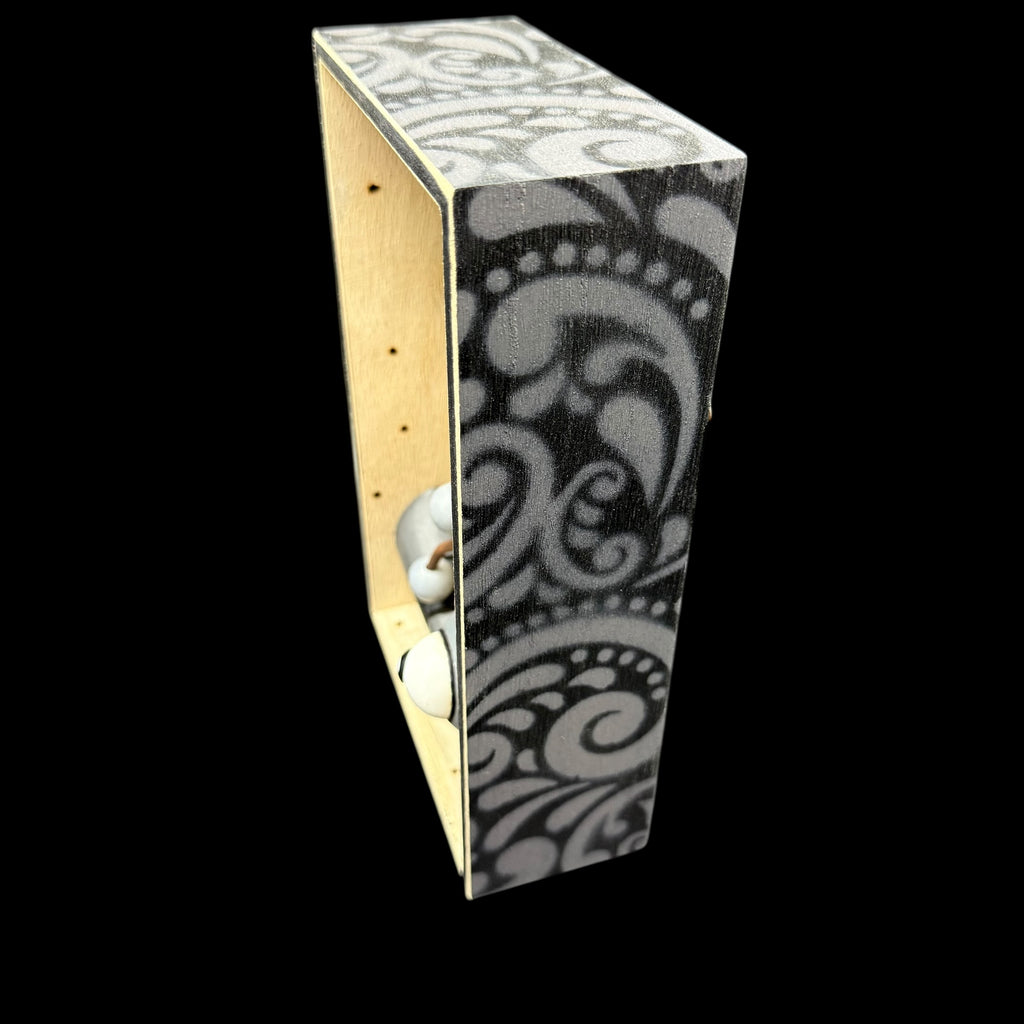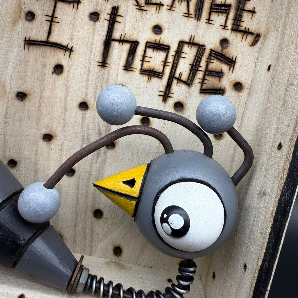 5 1/4"W by 8 1/2"H hand painted, sanded, detailed and wood burned box containing a hand carved, painted, wood burned, detailed assembled and attached C.R.E.E.P. character. The shadow box is equipped with a hanger on the back.
