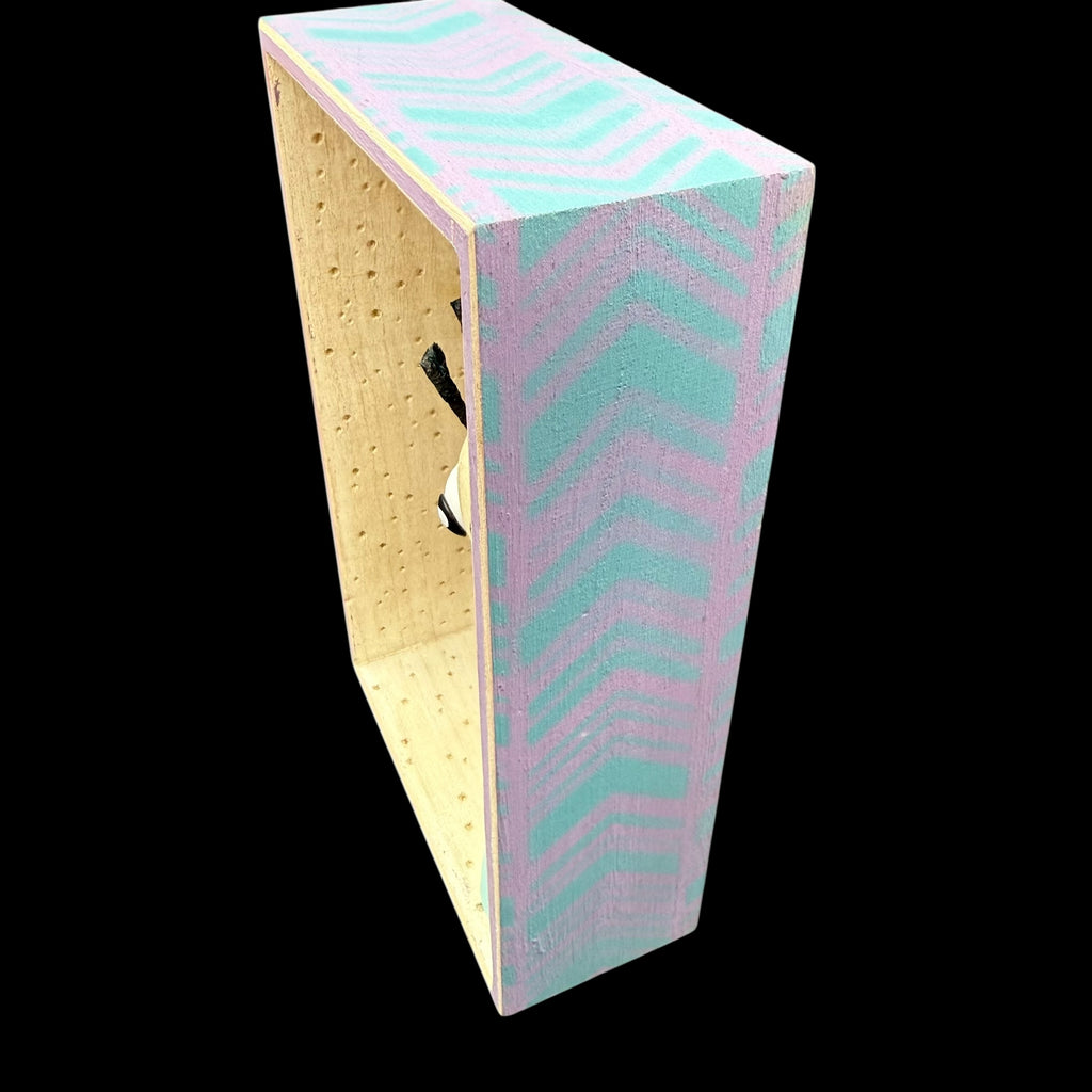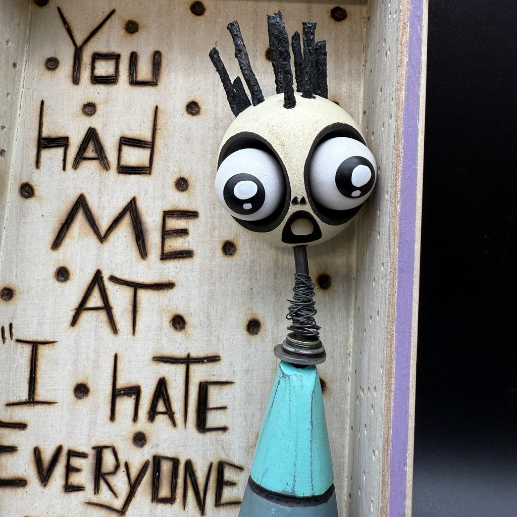 5 1/4"W by 8 1/2"H hand painted, sanded, detailed and wood burned box containing a hand carved, painted, wood burned, detailed assembled and attached C.R.E.E.P. character. The shadow box is equipped with a hanger on the back.