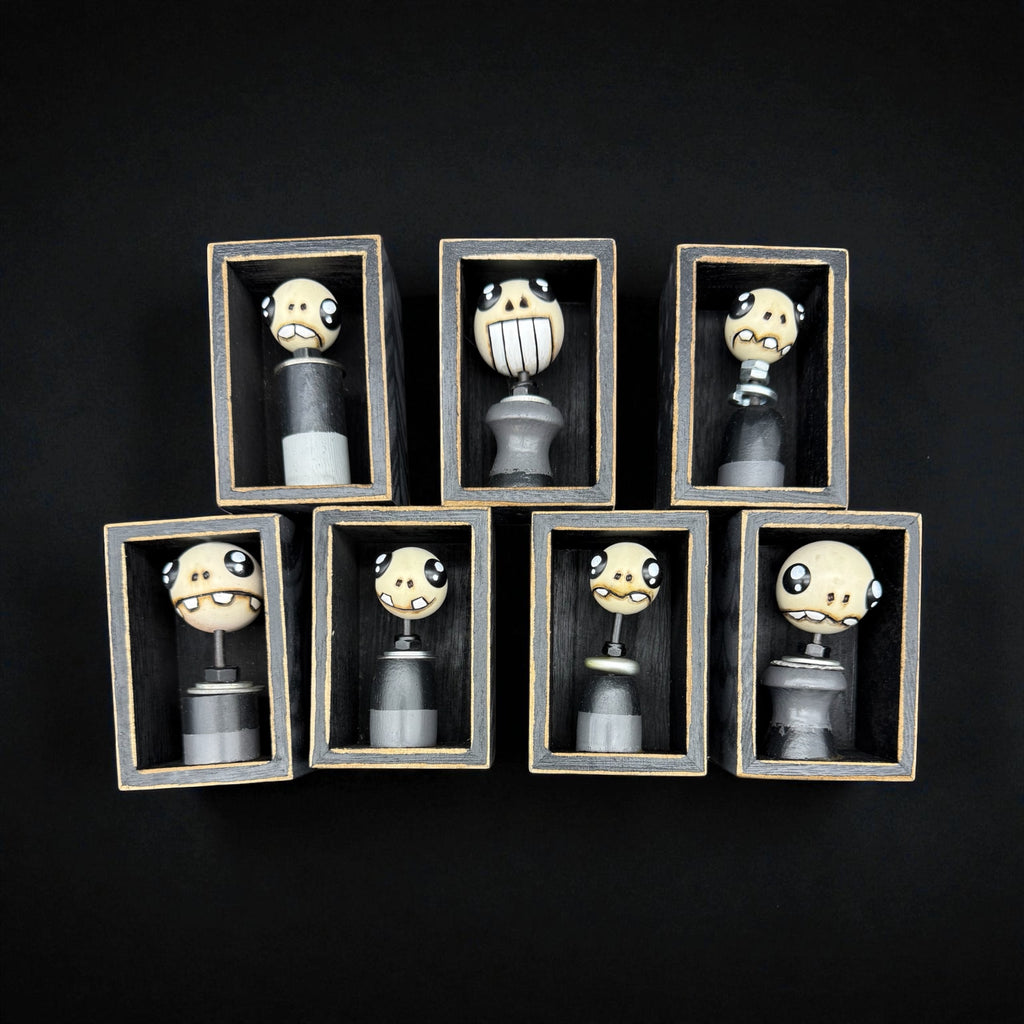 These lil dudes are $40 each with SHIPPING included! Each small painted wood box has a small hand-carved, hand-painted character attached inside with wood burned details. The average size of the box is 2.25 inches by 3.5 inches. We have a limited number of these little dudes. The lil dude you receive will be surprise! No two are alike, but we promise we will choose the perfect one to come live with you! So order this and adopt a mystery lil dude today!