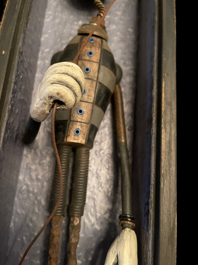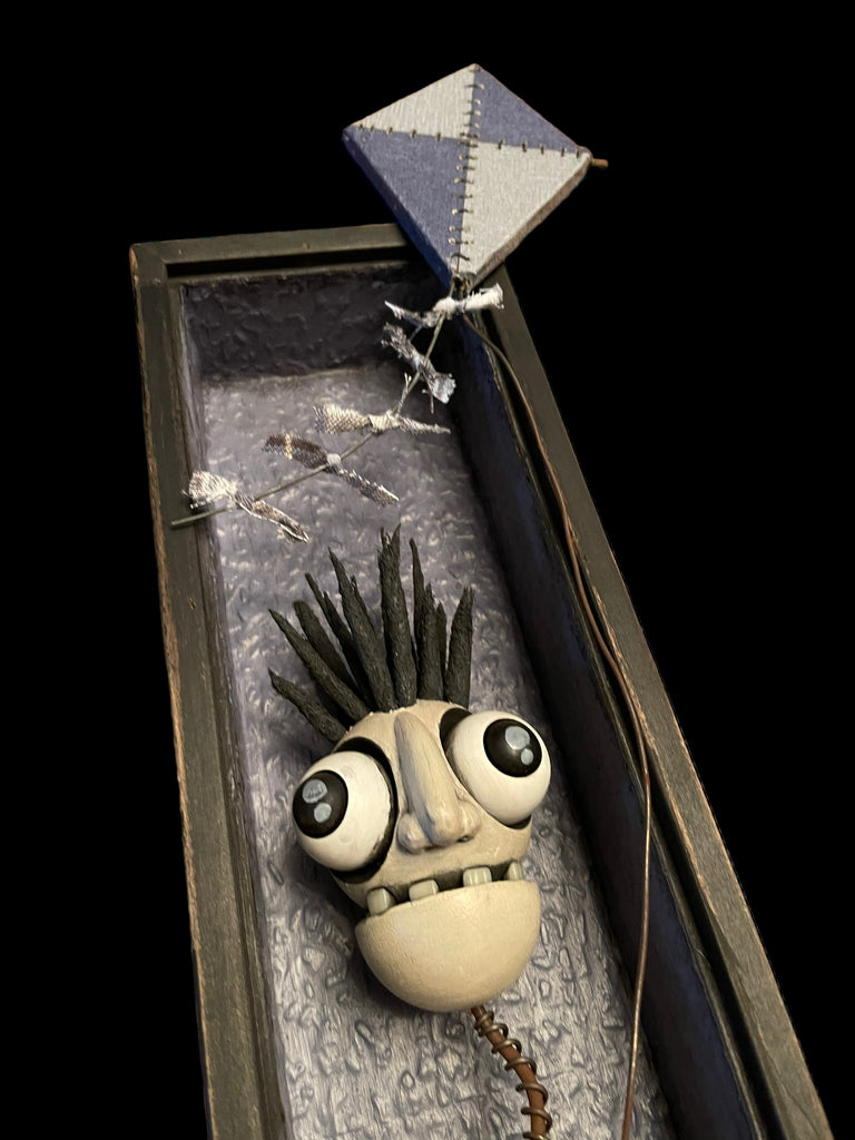 Hand carved and sculpted wood and metal character holding a hand carved and sculpted kite painted and wood burned details. Character is attached in a hand crafted shadow box. Hanger attached to back. Signed and dated.