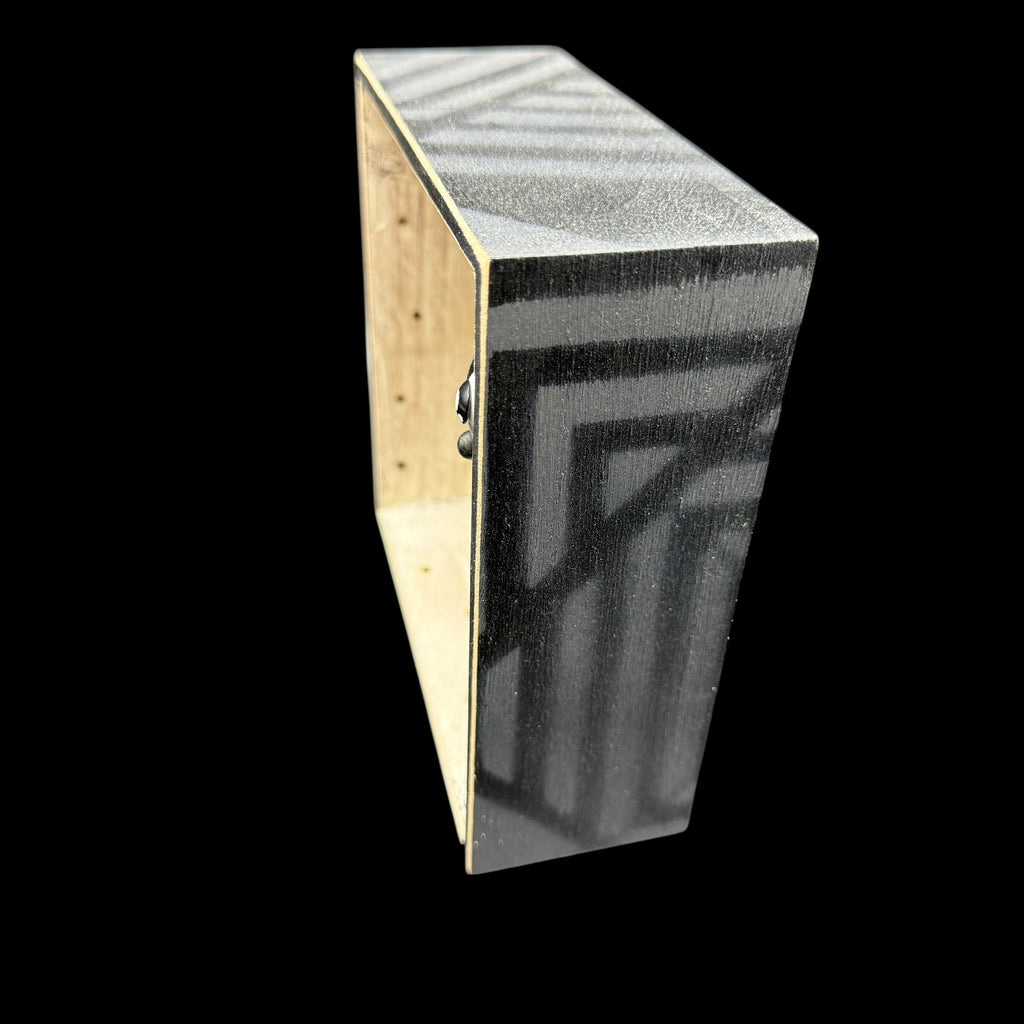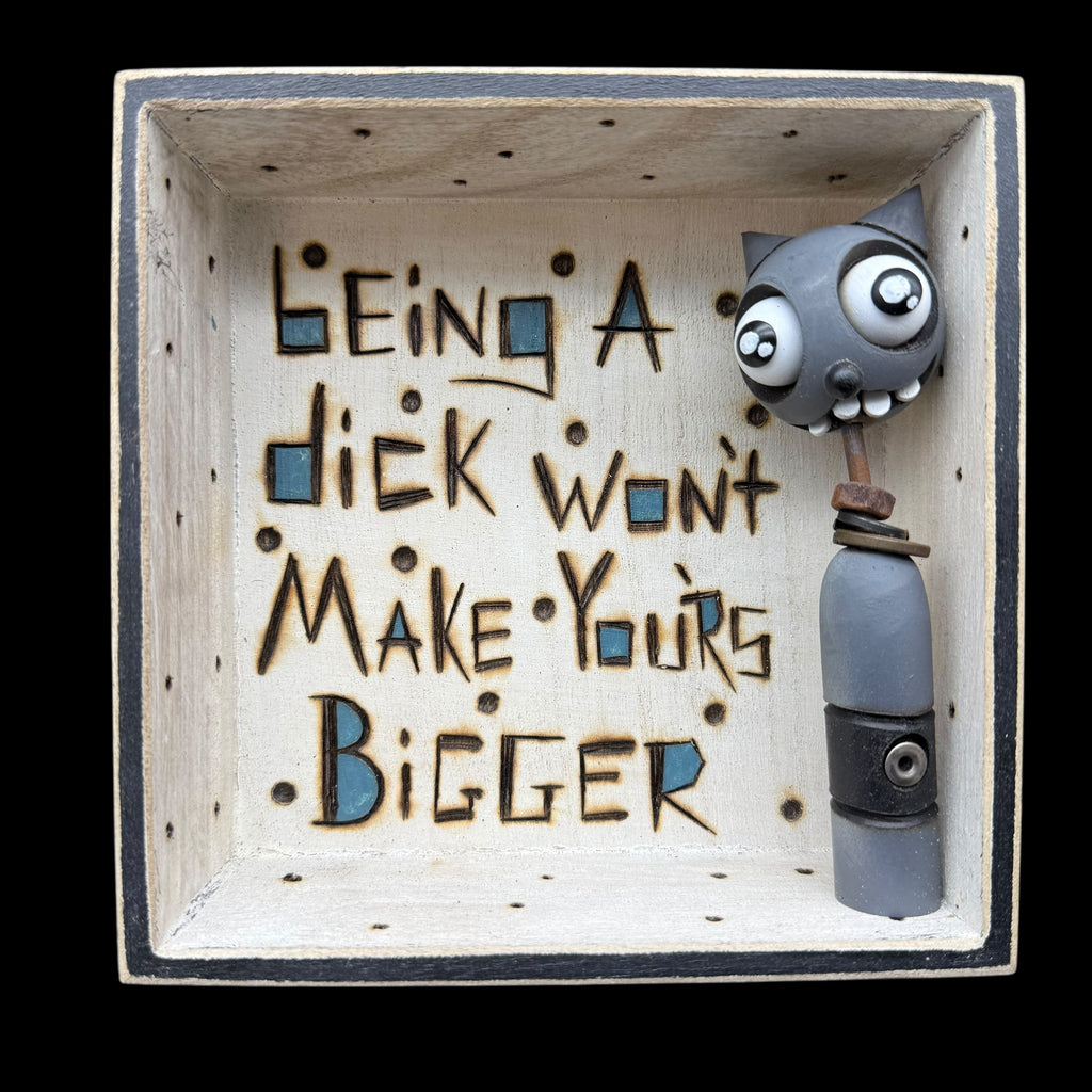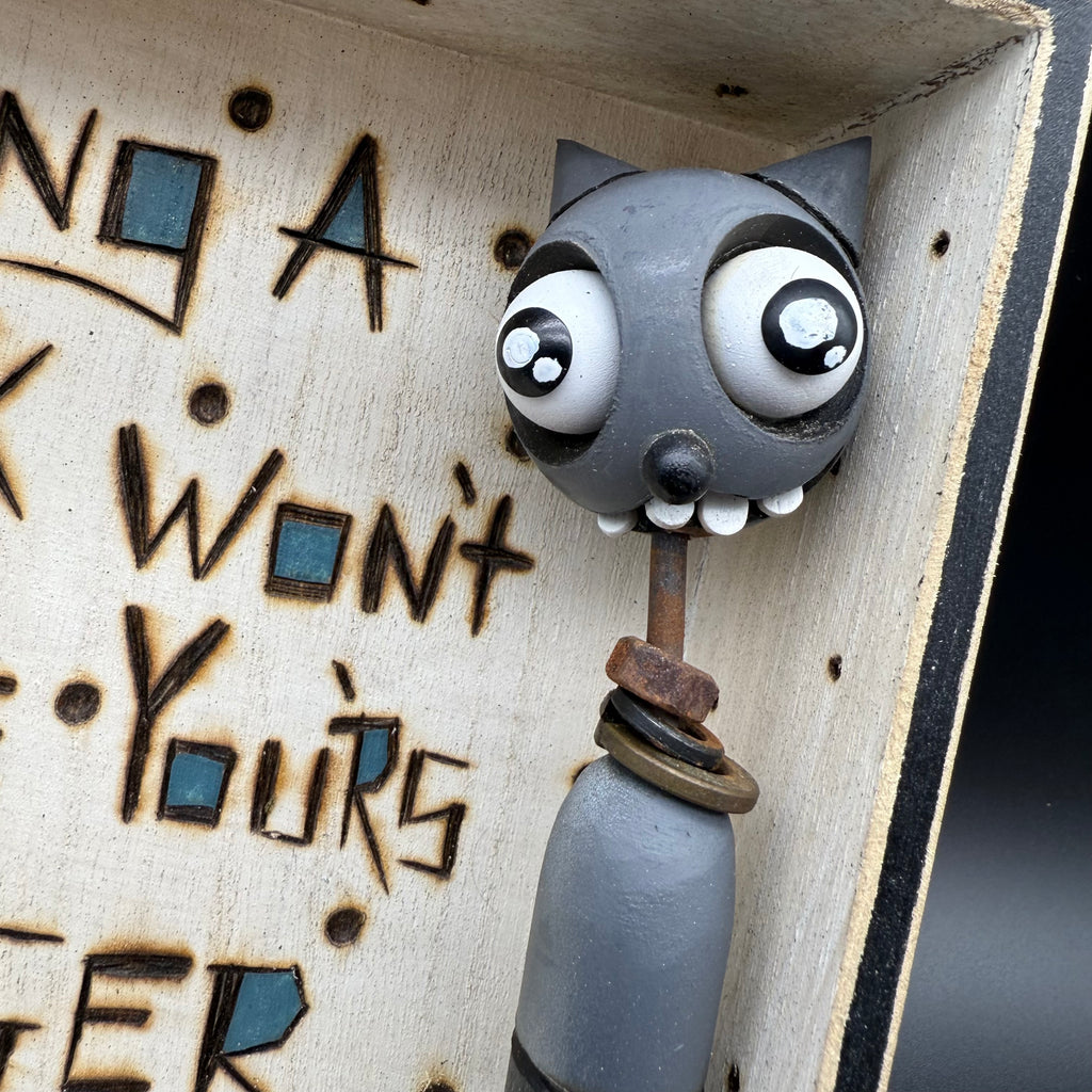 5 3/4"W by 5 3/4"H hand painted, sanded, detailed and wood burned box containing a hand carved, painted, wood burned, detailed assembled and attached C.R.E.E.P. character and floating, custom wood burned and hand-painted saying.