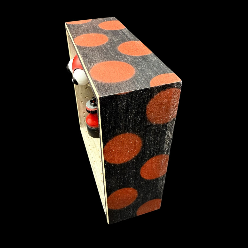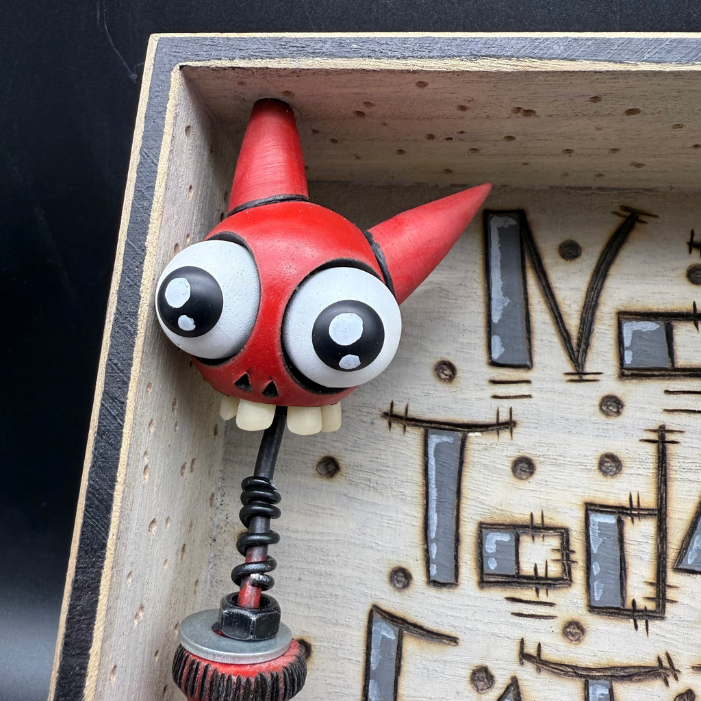 5 3/4"W by 5 3/4"H hand painted, sanded, detailed and wood burned box containing a hand carved, painted, wood burned, detailed assembled and attached C.R.E.E.P. character and custom wood burned saying.