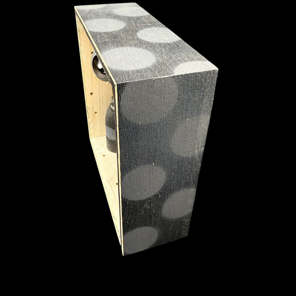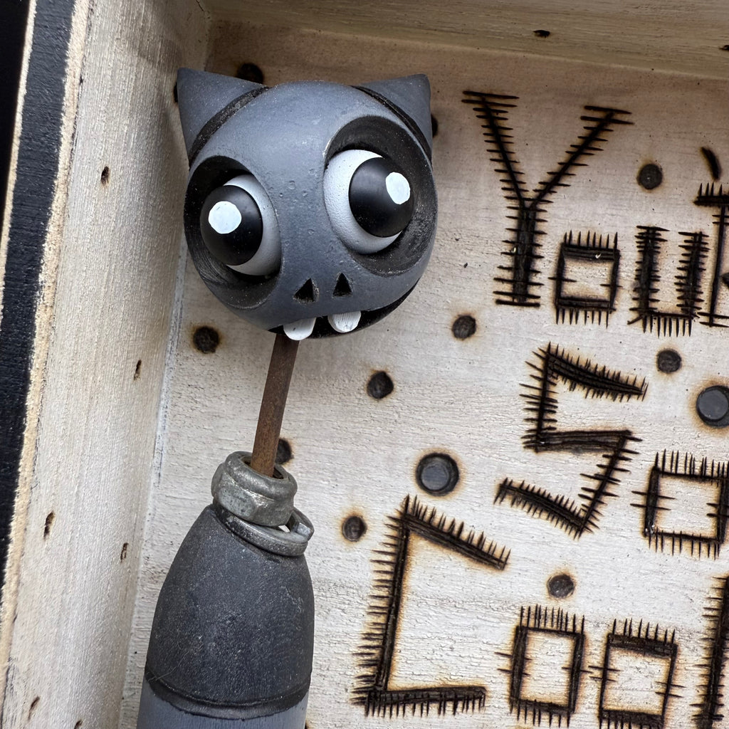 5 3/4"W by 5 3/4"H hand painted, sanded, detailed and wood burned box containing a hand carved, painted, wood burned, detailed assembled and attached C.R.E.E.P. character and custom wood burned saying.