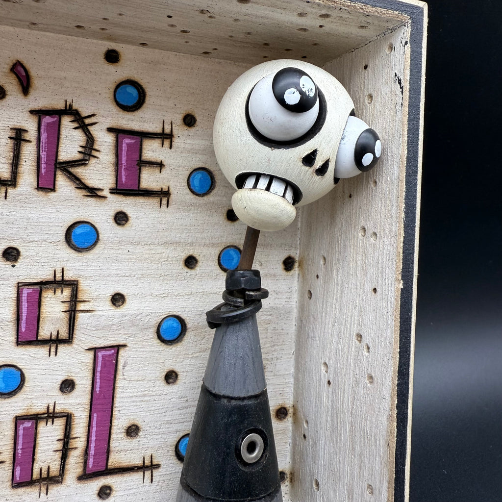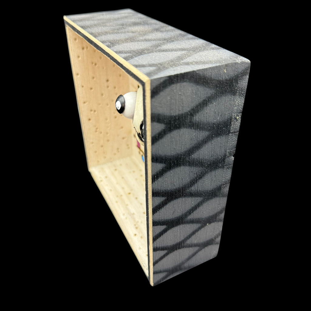 5 3/4"W by 5 3/4"H hand painted, sanded, detailed and wood burned box containing a hand carved, painted, wood burned, detailed assembled and attached C.R.E.E.P. character and custom wood burned saying.