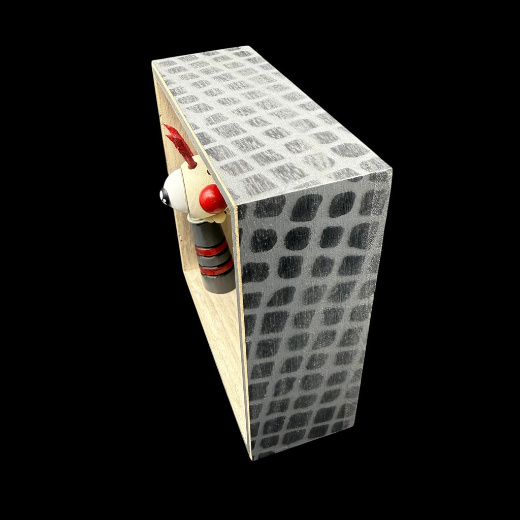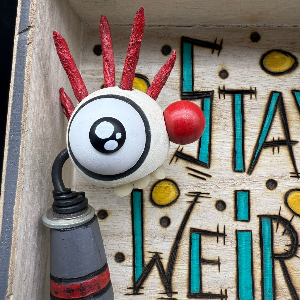 5 3/4"W by 5 3/4"H hand painted, sanded, detailed and wood burned box containing a hand carved, painted, wood burned, detailed assembled and attached C.R.E.E.P. character and custom wood burned saying.