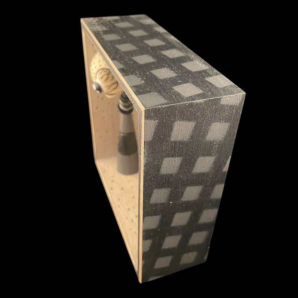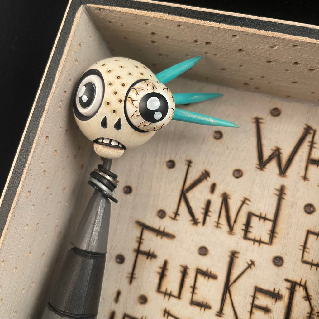 5 3/4"W by 5 3/4"H hand painted, sanded, detailed and wood burned box containing a hand carved, painted, wood burned, detailed assembled and attached C.R.E.E.P. character and custom wood burned saying.