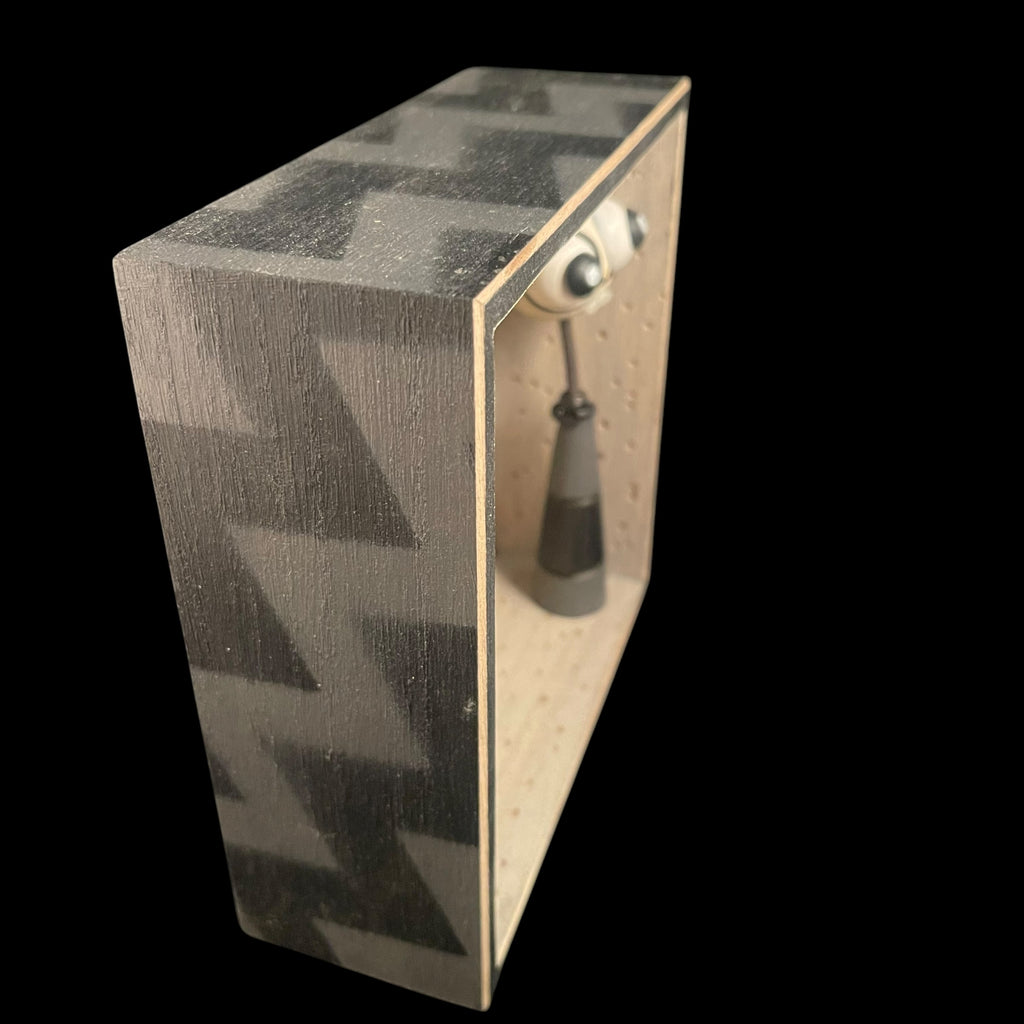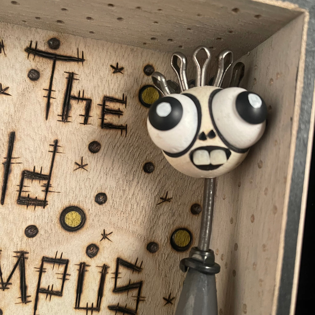 5 3/4"W by 5 3/4"H hand painted, sanded, detailed and wood burned box containing a hand carved, painted, wood burned, detailed assembled and attached C.R.E.E.P. character and custom wood burned saying.