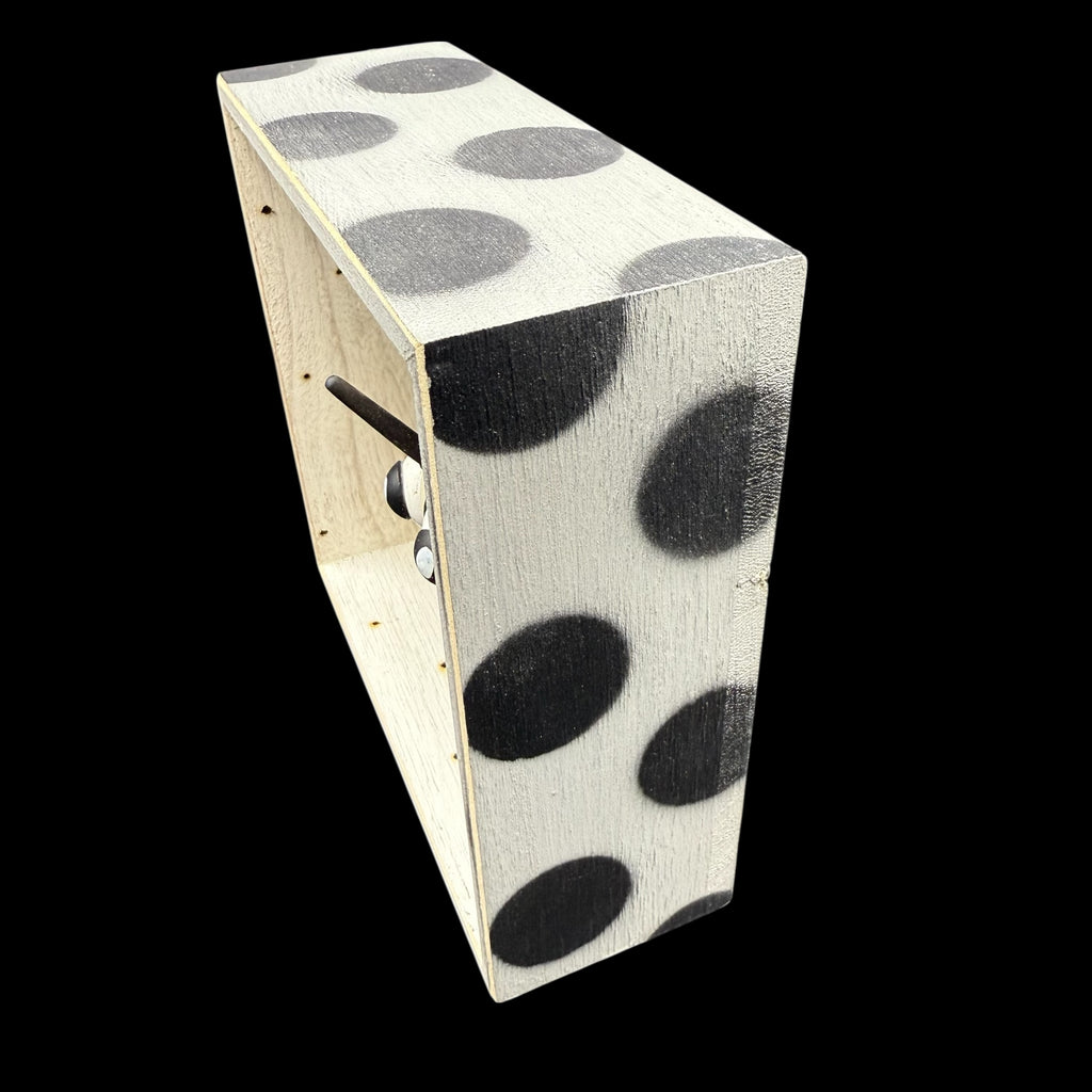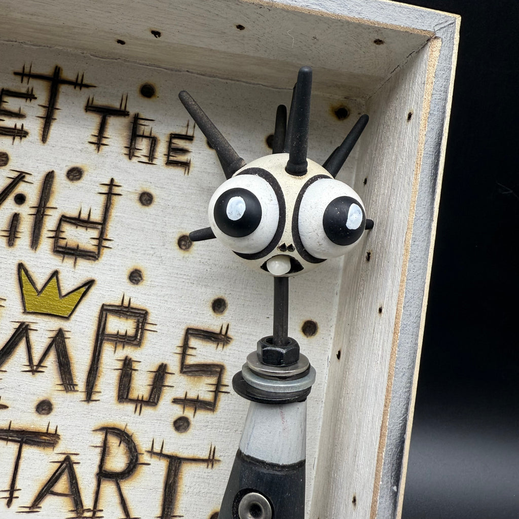 5 3/4"W by 5 3/4"H hand painted, sanded, detailed and wood burned box containing a hand carved, painted, wood burned, detailed assembled and attached C.R.E.E.P. character.