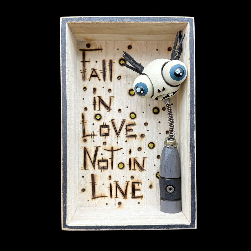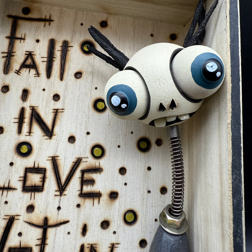 5 1/4"W by 8 1/2"H hand painted, sanded, detailed and wood burned box containing a hand carved, painted, wood burned, detailed assembled and attached C.R.E.E.P. character. The shadow box is equipped with a hanger on the back.