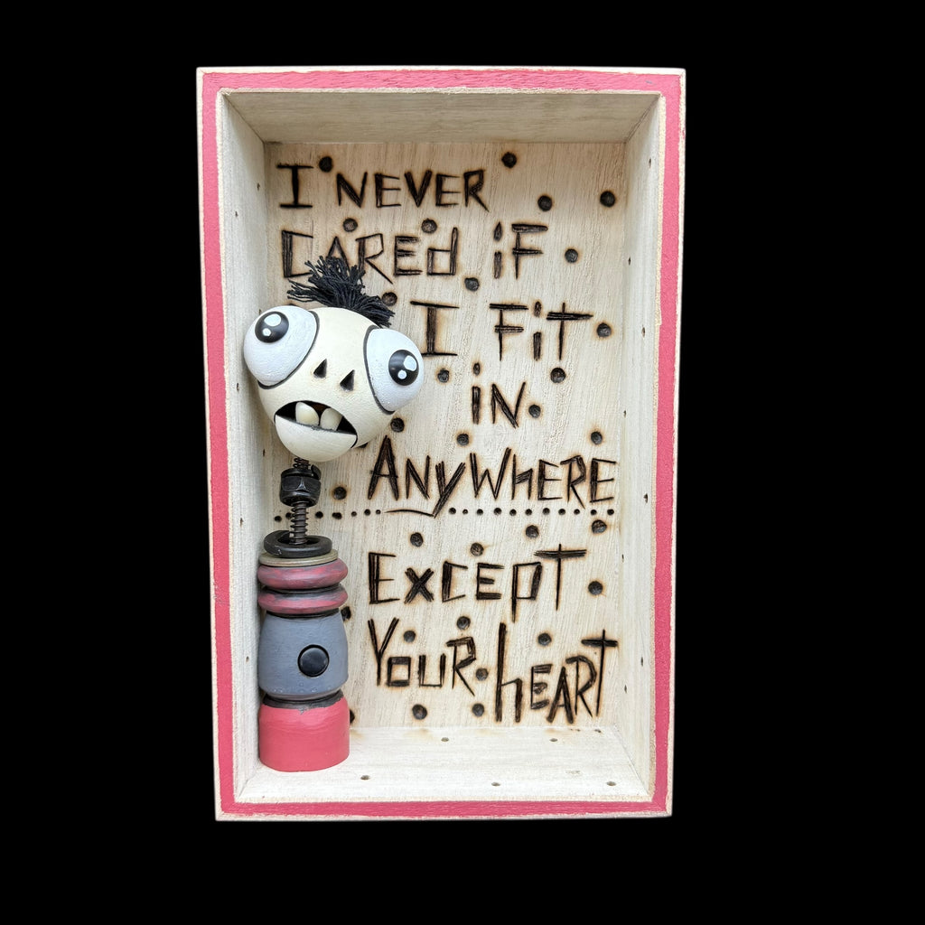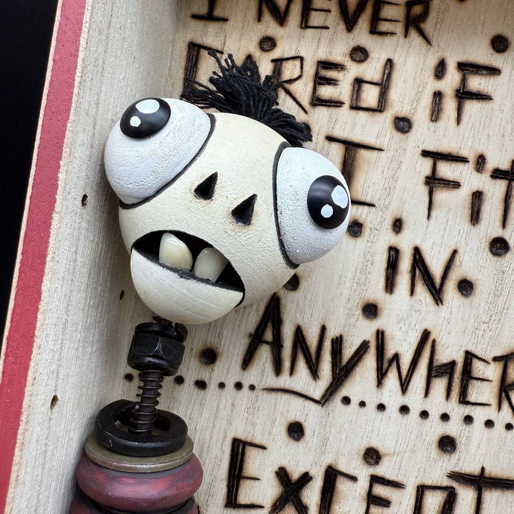 5 1/4"W by 8 1/2"H hand painted, sanded, detailed and wood burned box containing a hand carved, painted, wood burned, detailed assembled and attached C.R.E.E.P. character. The shadow box is equipped with a hanger on the back.