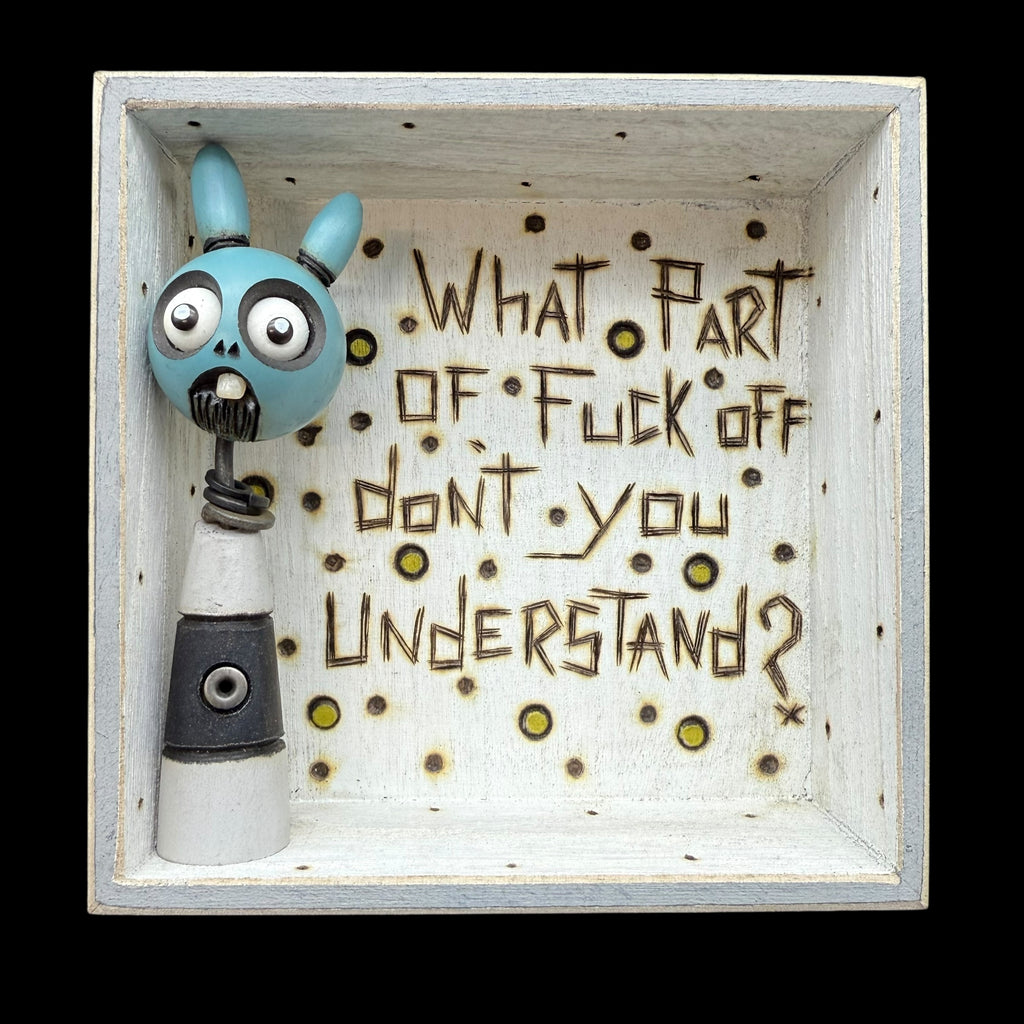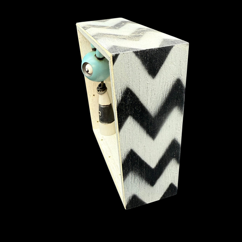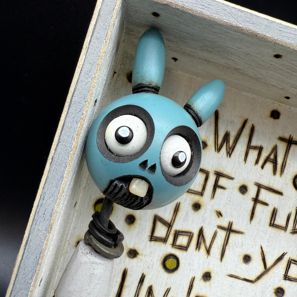 5 3/4"W by 5 3/4"H hand painted, sanded, detailed and wood burned box containing a hand carved, painted, wood burned, detailed assembled and attached C.R.E.E.P. character and custom wood burned saying.