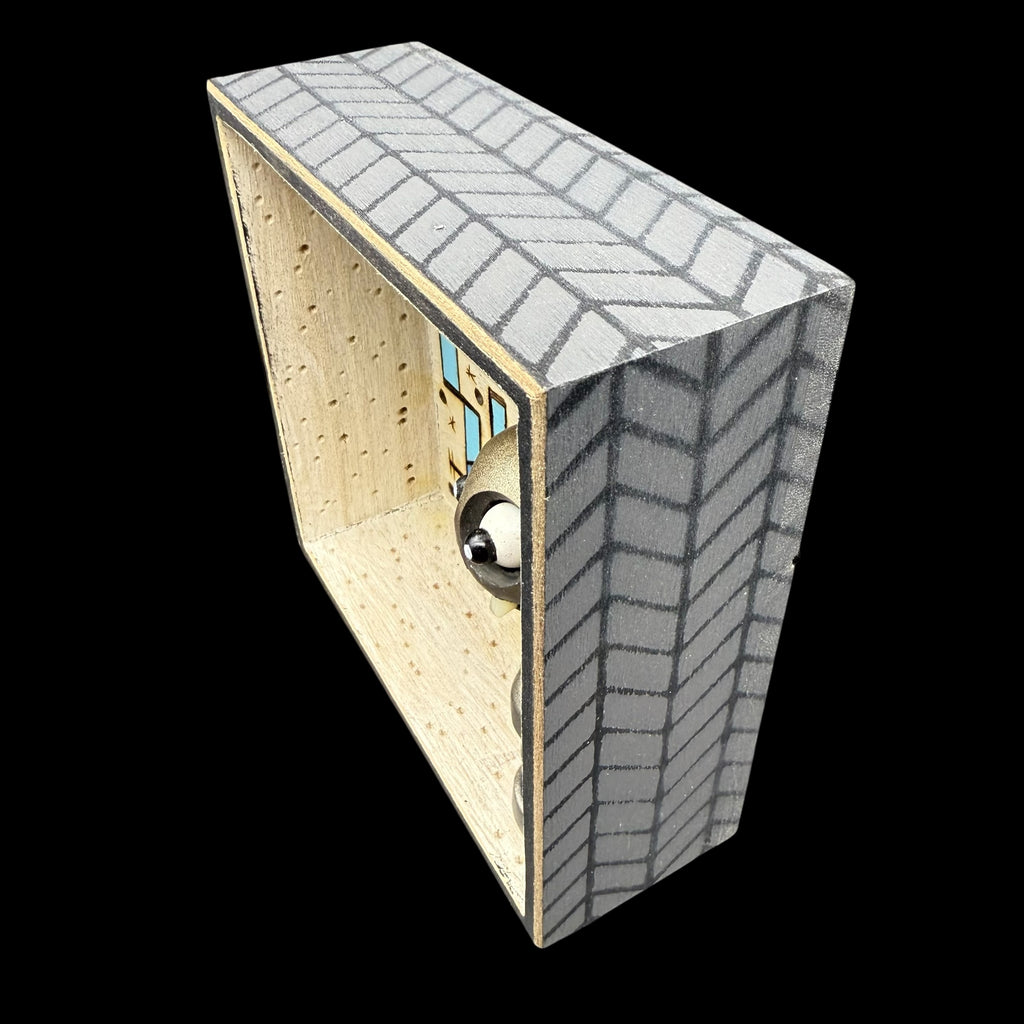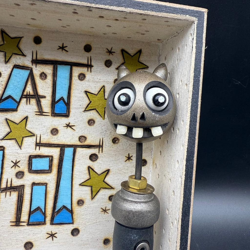 5 3/4"W by 5 3/4"H hand painted, sanded, detailed and wood burned box containing a hand carved, painted, wood burned, detailed assembled and attached C.R.E.E.P. character and floating, custom wood burned and hand-painted saying.