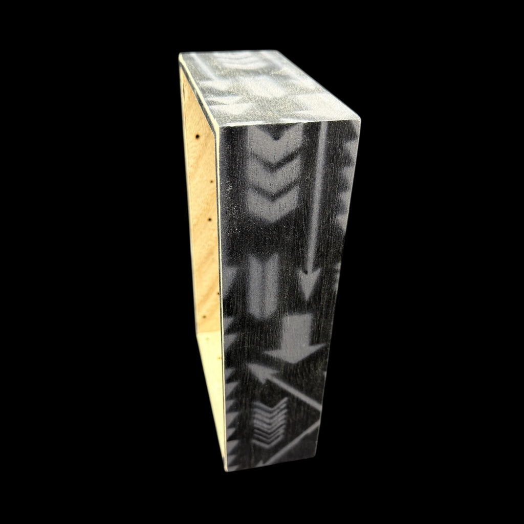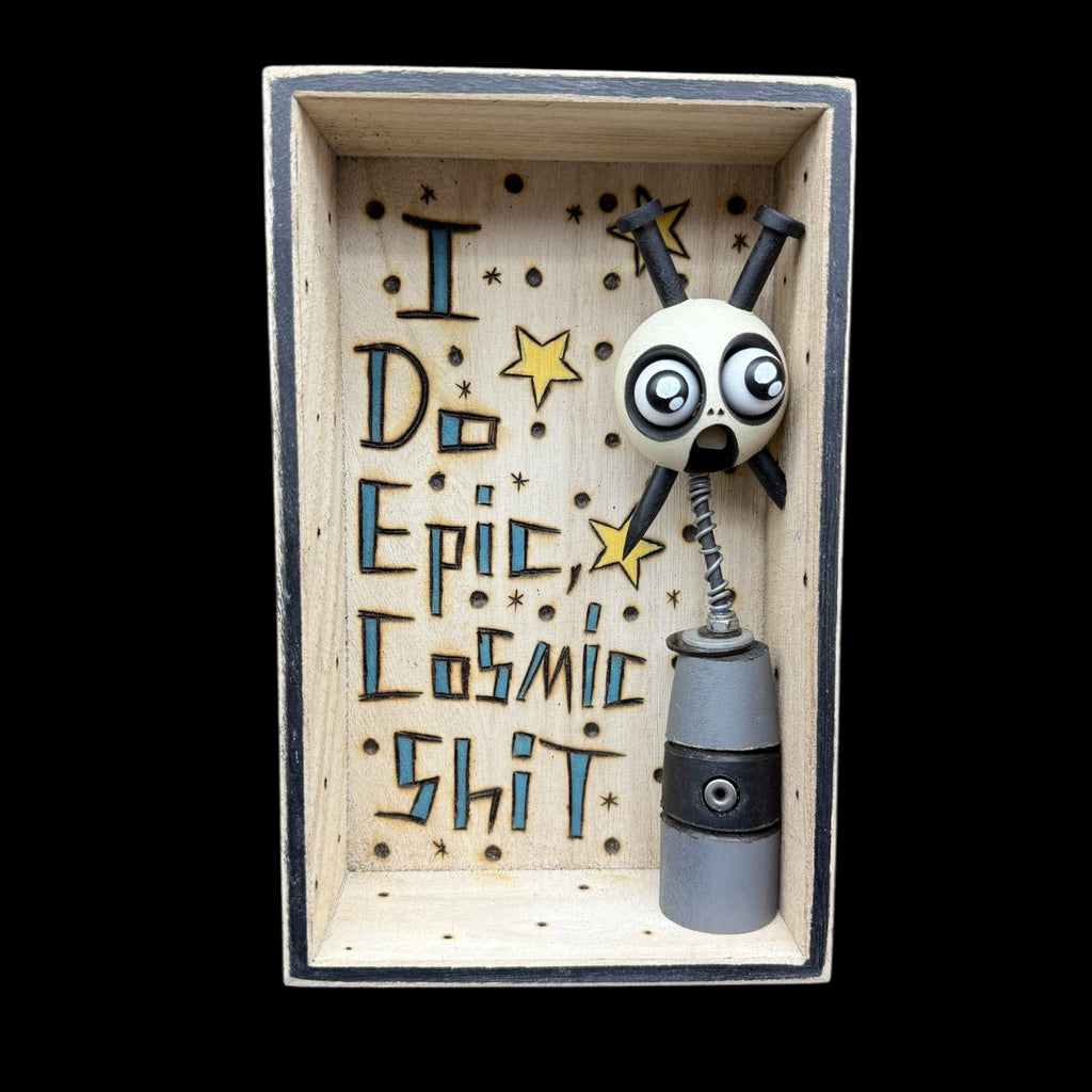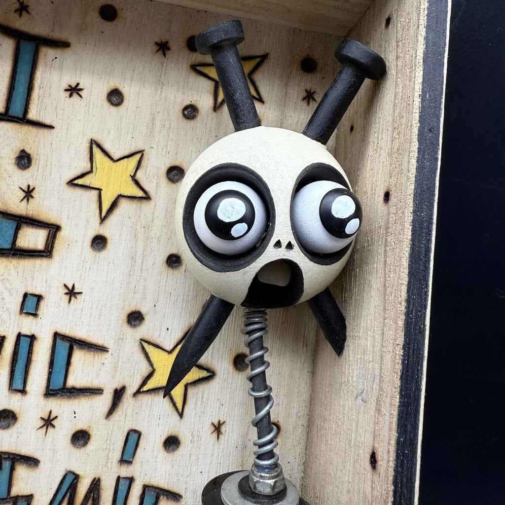 5 1/4"W by 8 1/2"H hand painted, sanded, detailed and wood burned box containing a hand carved, painted, wood burned, detailed assembled and attached C.R.E.E.P. character. The shadow box is equipped with a hanger on the back.
