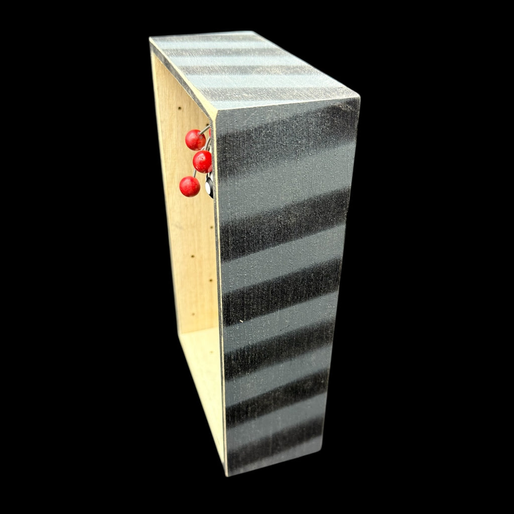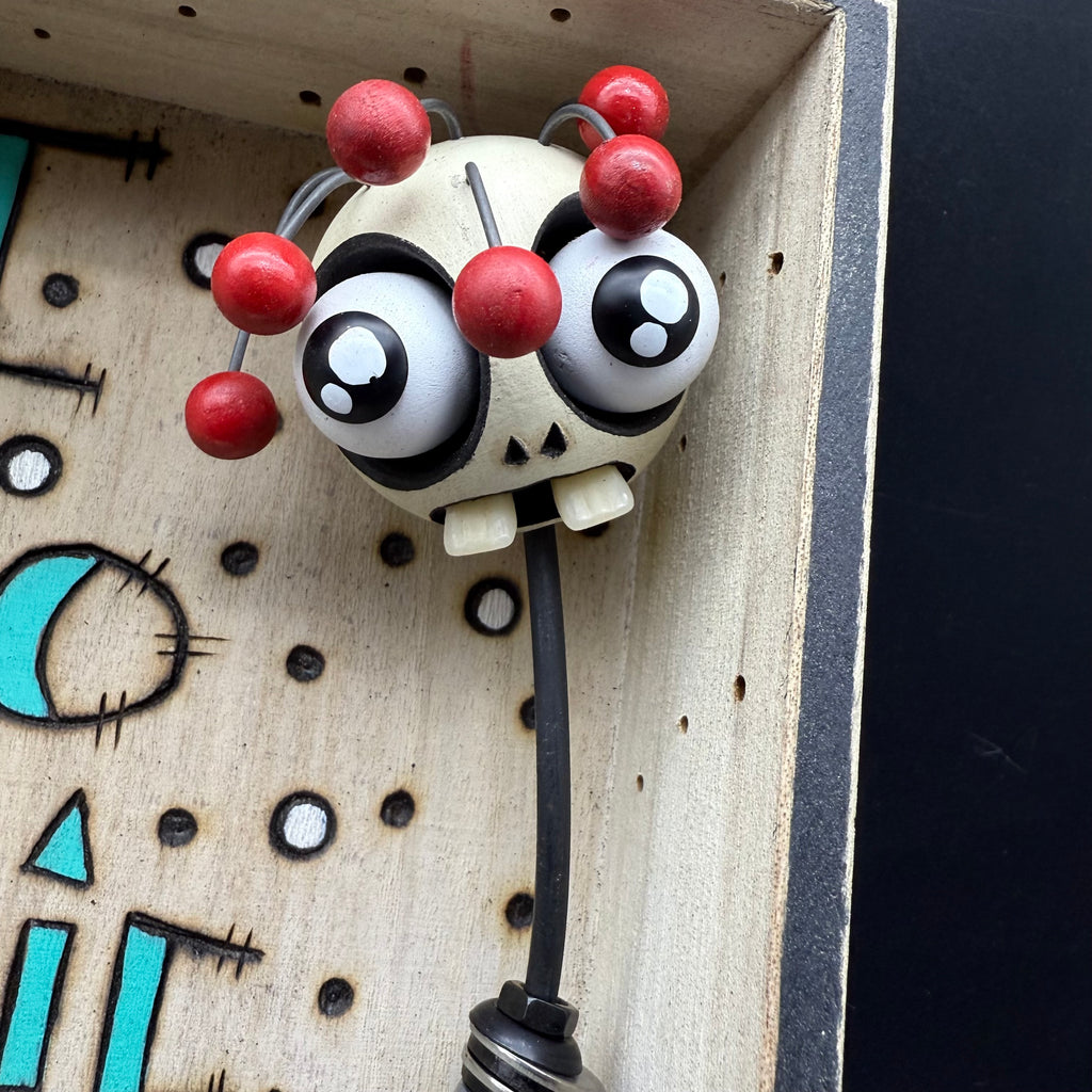 5 1/4"W by 8 1/2"H hand painted, sanded, detailed and wood burned box containing a hand carved, painted, wood burned, detailed assembled and attached C.R.E.E.P. character. The shadow box is equipped with a hanger on the back.