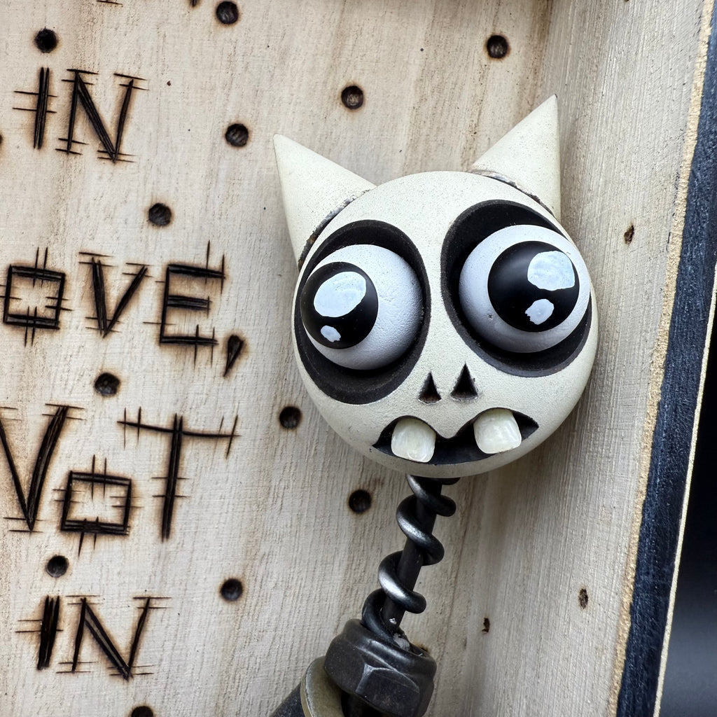 5 1/4"W by 8 1/2"H hand painted, sanded, detailed and wood burned box containing a hand carved, painted, wood burned, detailed assembled and attached C.R.E.E.P. character. The shadow box is equipped with a hanger on the back.